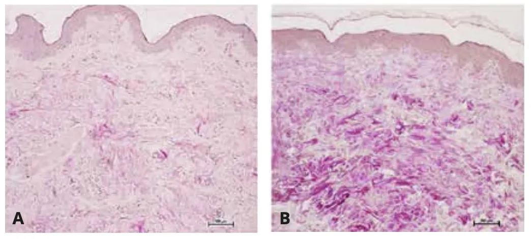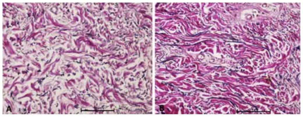 Humán bőr biopszia RedTouch kezelés előtt (A) és után (B), Weigert Van Gieson festési technikával. A képeken látszik, hogy a kezelés után az elasztikus rostok (sötét színűek) szintén párhuzamosabbak, egyenesebb lefutásúak és tömörebbek. A megváltozott szöveti szerkezet funkcionális szempontból jobb rugalmasságot feltételez.
